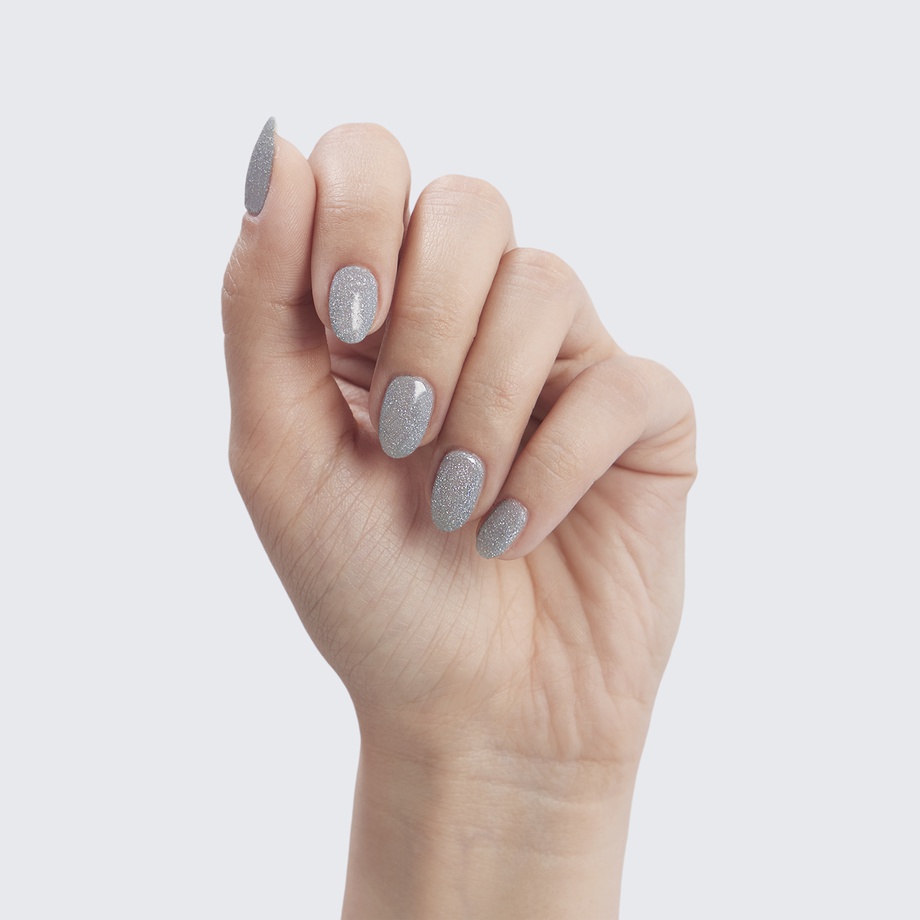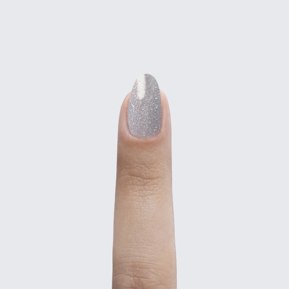 Light grey. 1 coat sheer, 2+ coats opaque. Sparkle. Cool undertone.